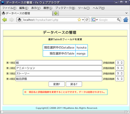 【新規テーブル名の入力】 テーブル名は,半角英数字で入力して下さい。 「このDataBaseに登録されているテーブル名」に表示されている名は入力しないで下さい。 ボタン「作成T」=> 【管理6】へ ボタン「戻るT」=> 【管理4】へ |