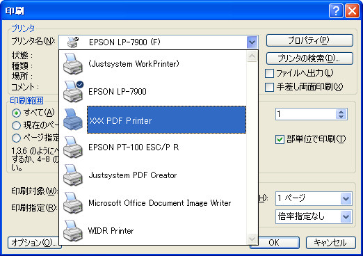 PDF変換方法として多いのは,変換ツールがプリンタドライバとして動くタイプです。このタイプはインストールすると仮想プリンタとしてプリンタフォルダに追加されます。アプリケーションソフトウェアで印刷するときに,図12のようにこの仮想プリンタを出力先に選び[OK]ボタンを押せば,設定画面と保存先のダイアログの後にPDFに変換して保存してくれます。印刷されたものと同じようにPDFファイルを作成してくれます。