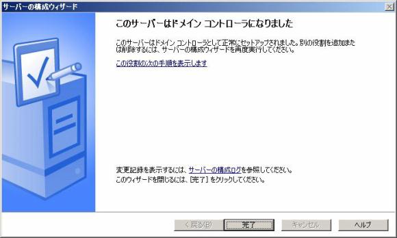| 図2-19 「サーバーの構成ウィザード」−「このサーバーはドメインコントローラになりました」 |