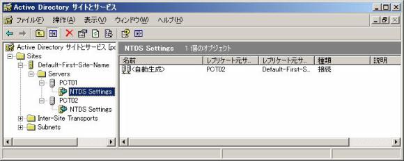 (22) レプリケーションを確認します。管理ツールから「Active Directory サイトとサービス」を選択し,ツリーを展開してPCT02の「NTDS Settings」を選択します。接続のオブジェクトが自動生成されているかを確認します。