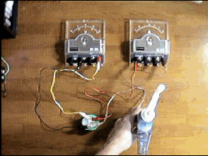 (3) 発電器を上図のようにまっすぐ保持して、放電中にミリアンペアー計の針が、小刻みに振れないように注意する。
