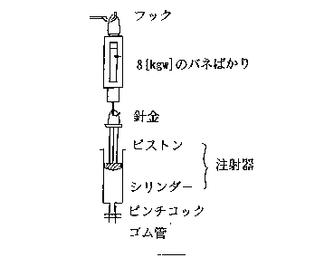ア.注射器の中の空気量を最小にしてゴム管をピンチコックではさむ。最大容量まで引いてバネばかりの最大値Fomax、最小値Fominをそれぞれ4回程測定し、それぞれ平均値を求める。この値を更に平均したものをFoとする。