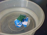F 穴をふさいだら、るつぼばさみか乾いたぞうきんで缶の上部を持って、水を入れた水槽に缶を放り込む。