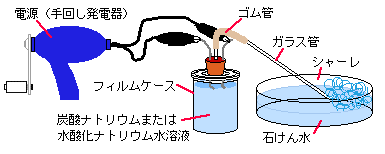 フィルムケース、ゴム栓(2号)、ステンレス針金(太さ約1mm)、ガラス管、リード線、ゴム管、炭酸ナトリウム(または水酸化ナトリウム)、電源(または手回し発電機)、シャーレ、中性洗剤、ガスマッチ、ろうそく、デザインナイフ、ドリル(1.5mmと5.0mmの刃)