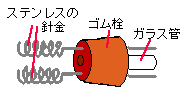 | 1 電極を作る @ 25cmほどのステンレス針金を棒などに巻きつけ、らせん状の電極を2本作る。 A ゴム栓にドリルで穴をあけ、中央の穴にはガラス管を、両側の穴には、ステンレス針金の電極を通す.針金は、触れ合わないようにする。 |