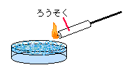 | 3 水素爆鳴気に点火する @ シャーレの液面が泡で一杯になったら、火のついたろうそくで点火する。 |