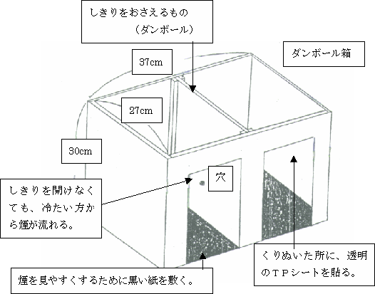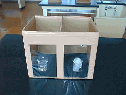 | ダンボール(27cm×37cm×30cm程度のもの) 黒い紙(煙を見やすくするために底に敷くもの)TPシート(透明) ダンボール(しきり板) 湯煙(ドライアイスに湯をかけたもの) ビーカー(100ml) 水 |