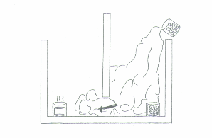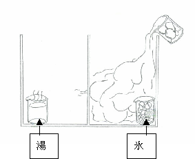| しきり板をあけたところ (図2) B 図2のように、煙が入ったらしきり板をあけ、 煙(寒気)が暖気の方へ流れるのを観察する。 C 煙を湯の方へ入れた場合は煙は動かない。 しきり板を上げるかわりに、そこに小さな穴をあける方法や、煙のかわりに、しきりの下に吹き流しのようなビニールをつける方法もある。 |