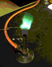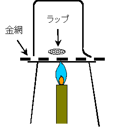 (1) 銅線の先を小さく丸めて青い炎の先でしばらく焼き、炎が青緑色に着色しなくなることを確かめる。