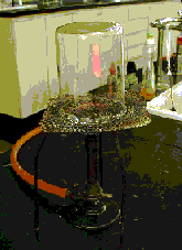 (1) 燃焼実験で刺激臭のあった試料(PVC製品)の小片を三脚にのせた金網に置き、内側を蒸留水で少しぬらしたビーカーをかぶせ、バーナーでおだやかに試料を加熱する。