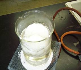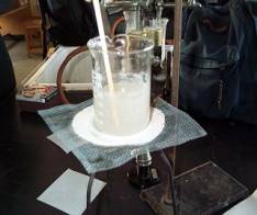 | (3) | のり状になってきたらかき混ぜるのをやめる。1000mlビーカーにお湯を400ml程度入れておき、そこに(2)の500mlビーカーをつけて、40℃以下にならないようにバーナーで温めておく。このまま40分保温する。 | |
