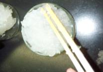(5) | 固まってきたら、シャーレに移し、押さえながら形を整え、5分ほど待つ。 |