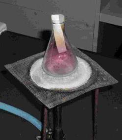| (3) | 三角フラスコに米粒程度の大きさのヨウ素結晶を入れ、ガスバーナーでヨウ素の蒸気(紫色)が出るまで穏やかに加熱する。 | ||