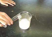 | (5) | 豆乳を、洗浄した500mlビーカーに入れ、約80℃まで加熱する。豆乳100mlに対して、4%塩化マグネシウム水溶液を15ml入れる。箸で3回十字を切るように、静かに豆乳と塩化マグネシウム水溶液を混ぜる。数分放置すると豆乳は凝固してくる。このときかき混ぜすぎるときれいに凝固しない。 |