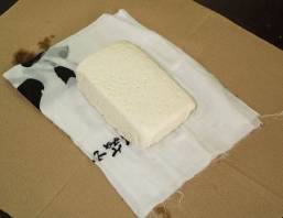| (6) | ボウルに穴をあけた豆腐の空き容器を置き、中にガーゼを敷き、固形物を流さないように注意してビーカーの中の上澄み液だけを流しへ捨て、固形部分を静かに豆腐の空き容器に入れる。ガーゼで包んでから、別の豆腐の空き容器で押してろ過、成形する。 | ![]() |