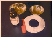 (2) 小さいステンレスボウルにエチルアルコールを少し入れて、ライターで火をつける。このときボウルの下には濡れぞうきんを敷いておくこと。