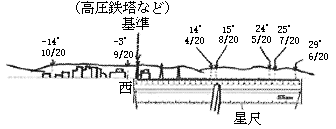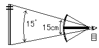 | 目を突かない程度(約1cm)に角材の端を目に近づけ、目標物の長さを定規の目盛りで読む。この場合、定規の目盛り1cmは、角度でほぼ1゜になっている。 | ![]() |