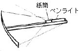 | 角材にペンライトを取り付けておくと、目盛りを読むときに便利である。ただし、光が四方に広がるタイプは、目に直接光が入るので使いにくい。(その場合には紙筒などをかぶせて遮光する)また、明る過ぎるものも使いにくい。 | ![]() |