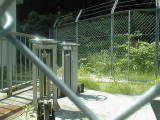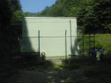 巴川の支流の百田川から水を取水します。建物はポンプ室で、浄水場へ水をくみ上げます。まわりには、人が入れないようにフェンスがやってあります。