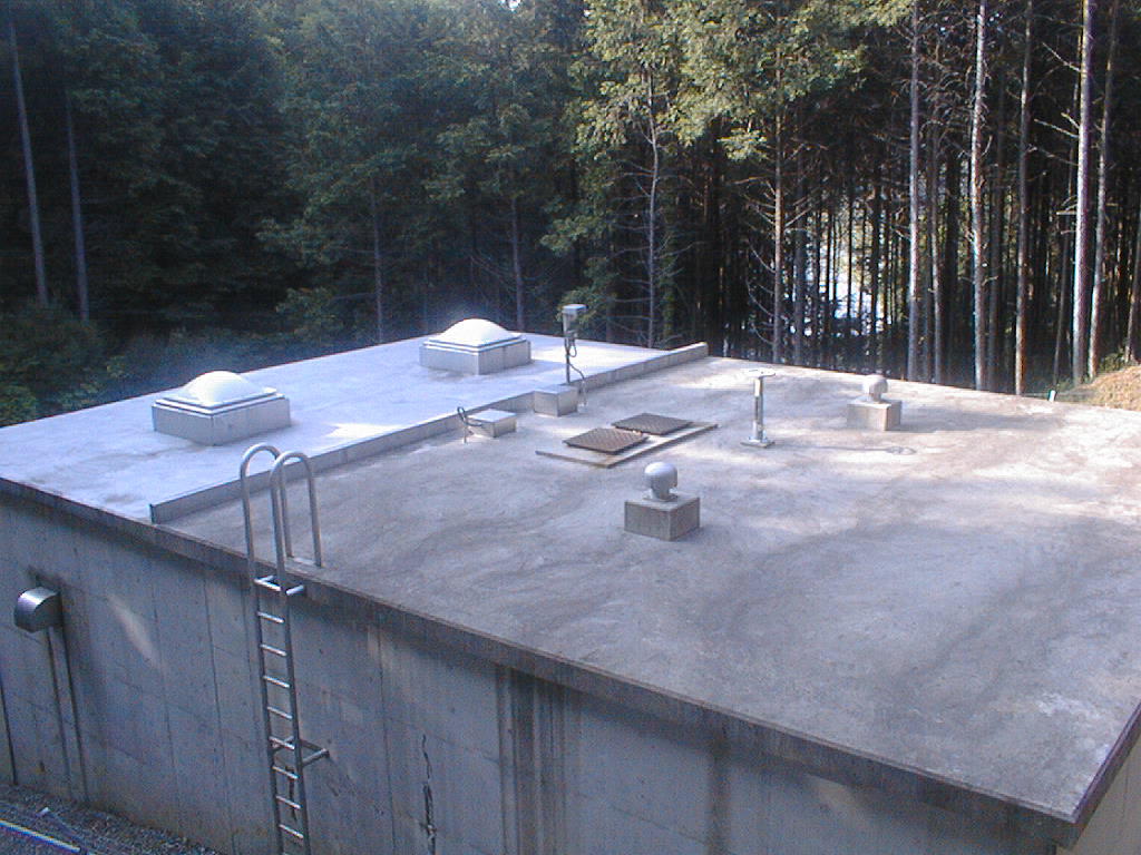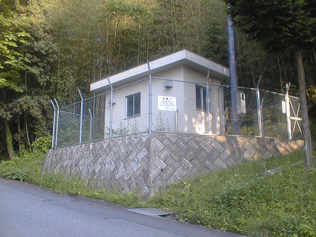 四ツ松配水場です。浄水場から地域で一番高いこの場所へポンプで水がくみ上げられてきます。ここから、水は高いところから低いところへ移動する性質を利用して、各家庭へ送られます。