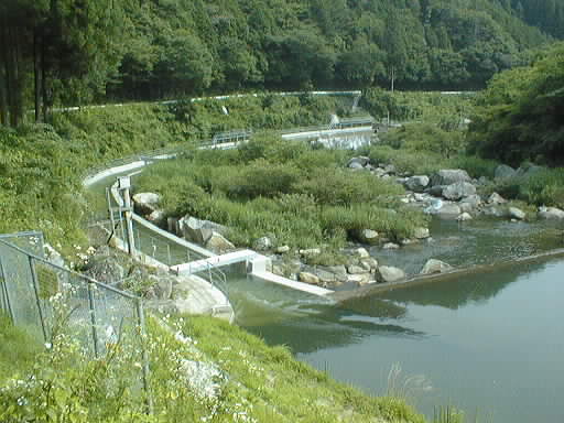 巴川にはたくさんの水力発電所があります。水は高いところから低いところへ流れる性質を利用して、高いところの水を取水し、そして、水を落下させ、水車を回して電気を起こします。
