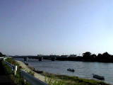 三河湾へ入る前の矢作古川です。海用の漁船がとまっています。