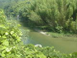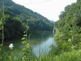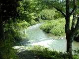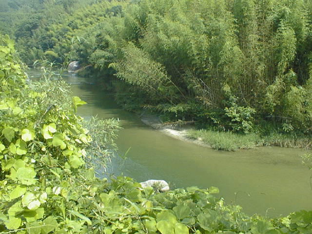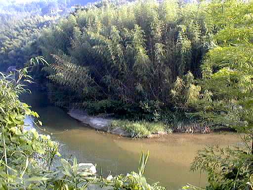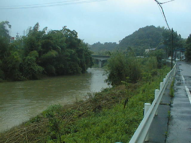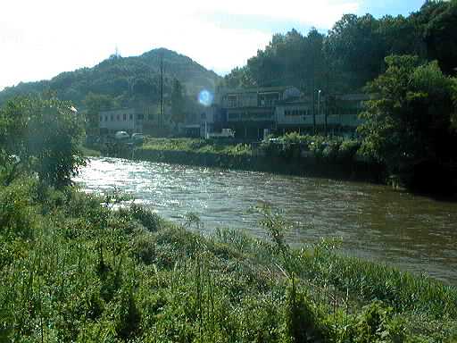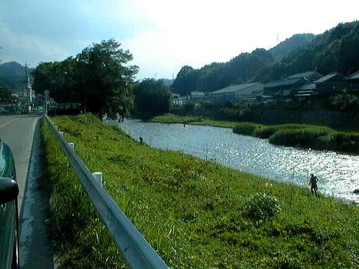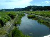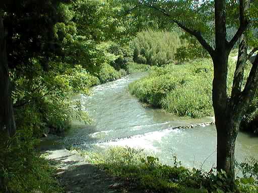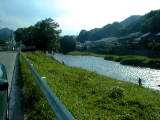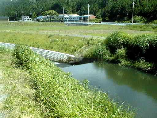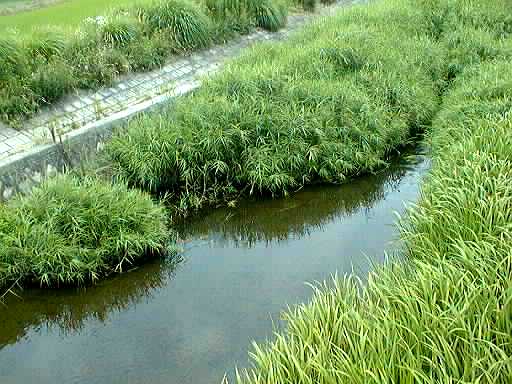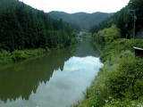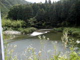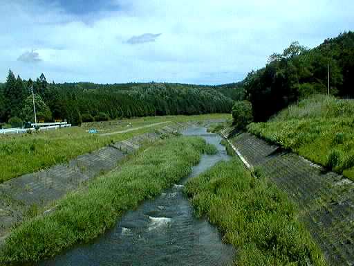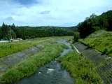 作手村を大きく蛇行したあと、改修された護岸のところを流れる矢作水系巴川です。流れがゆるやかで、川一面に草におおわれているところがあります。