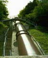 巴川水力発電所です。高いところで取水された水がいきおいよく導水管をおりてきて、発電所の中の水車を回して電気を起こします。