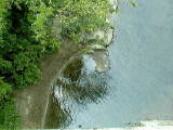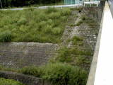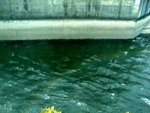 まん中と右側の写真は、ダムから放水された水がおちるところで、水のいきおいをゆるめるています。放水される量の違いが、コンクリートのかべにあとになって残っています。