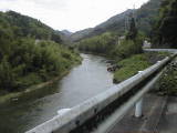 下山村平瀬です。川がどんよりしています。この先では、川がせき止められて、水力発電用の水が取水されています。