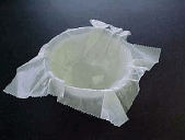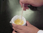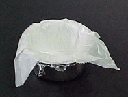 | (2) 重曹卵の準備 茶碗などに卵白約4gと炭酸水素ナトリウム約12gを入れ、よくかき混ぜる。(かなりかたくなり混ぜにくい)その後、砂糖約2gを加えてかき混ぜる。(砂糖を混ぜると柔らかくなる)これを流し込み用容器の中に、アズキ〜タイズ粒ぐらいずつ分ける。(写真3) |