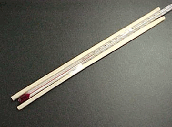 | (3) 温度計の準備 温度計を割りばしではさみ、セロハンテープを巻き付けて固定する。このとき、温度計の先端は、割りばしの先端よりも少し内側になるようにしておく(写真4)。(かき混ぜ棒と兼用にして使用できる) |