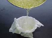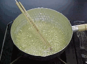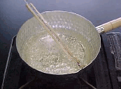 | (4) 砂糖蜜の加熱 @ 鍋に砂糖300gを取り、水150gを加えてかき混ぜる。 A 鍋を火にかけ、加熱する。110℃を超えるまでは、強火で加熱してよいが、それ以後は、130℃までゆっくり加熱する。130℃あたりになると、蜜の粘りけが強くなり、泡が大きくなる。また、砂糖蜜の色がやや黄色っぽく変わってくる(写真5)。 |